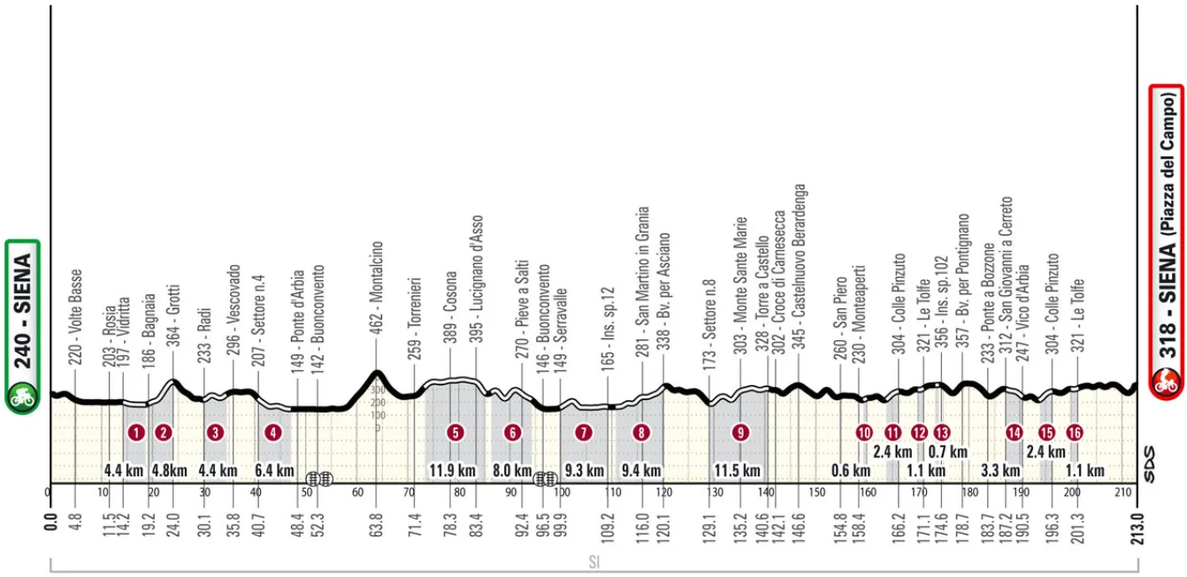 Der er fundet plads til hele 16 gruspassager i årets Strade Bianche. Det er særligt midtvejs igennem løbet, at det for alvor bliver hårdt. På femte passage - Luciginano d'Asso - er den 11,9 kilometer lang. Der kommer en kort pause inden Pieve a Salti, der med sine 8 kilometer også kan mærkes.