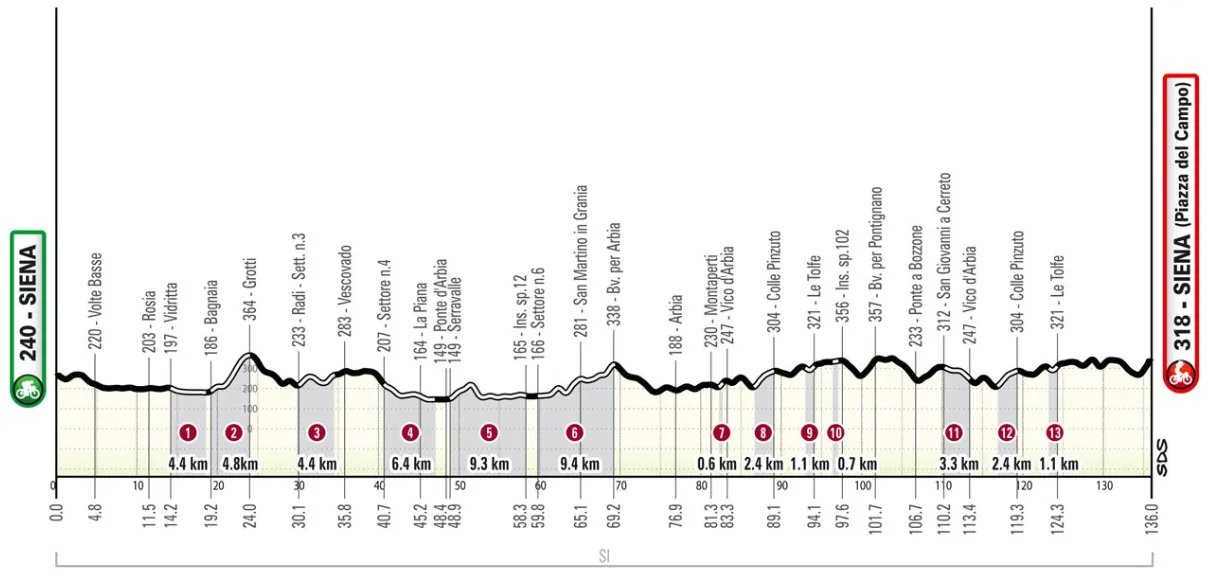De første 70 kilometer skaber en voldsom udskilning, mens de resterende 70 kilometer handler om at udvise udholdenhed i det kupereede landskab. Der bliver som altid lavet forskelle i det her løb, der kan betragtes som ét langt udskilningsløb, og når de rammer Siena, er kun de mest velkørende ryttere tilbage.